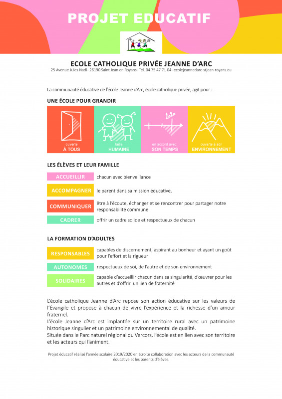 Afin que notre école puisse faire face aux nouveaux défis de l'Education, afin que nous réaffirmions qui nous sommes, afin que nous donnions un sens à nos actions éducatives, les parents, les enseignants et les acteurs de notre établissement ont réécrit durant l'année scolaire 2019/2020 le projet éducatif de l'école Jeanne d'Arc.